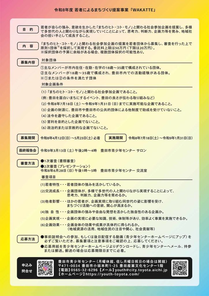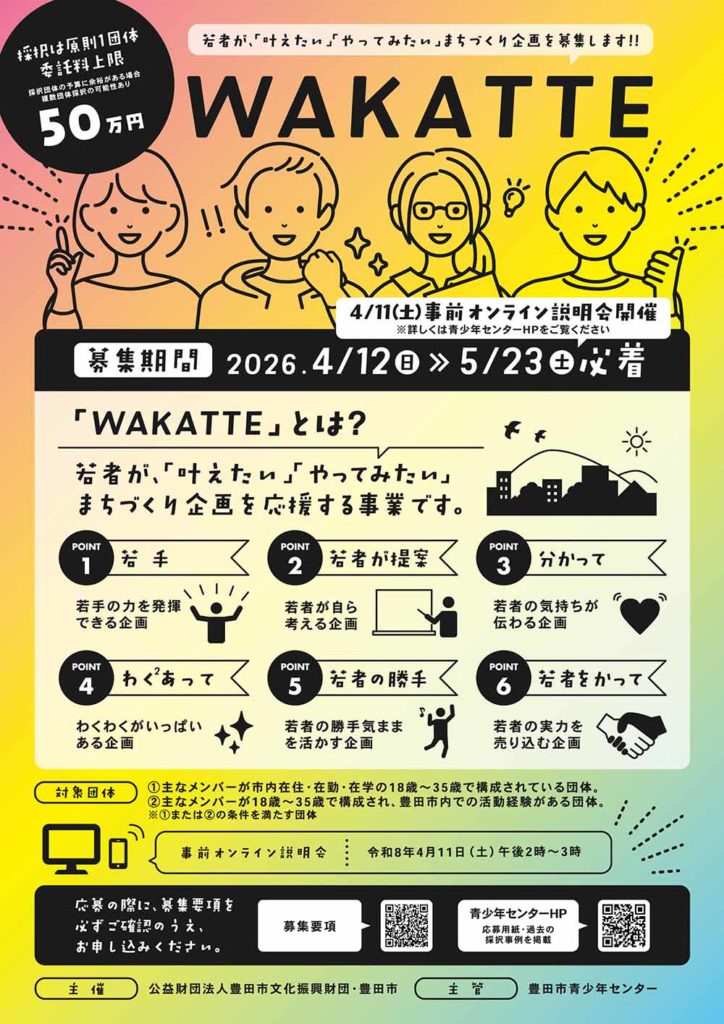豊田市青少年センター | 【まちづくり企画募集】若者の叶えたい!やってみたい!を応援します!R8WAKATTE